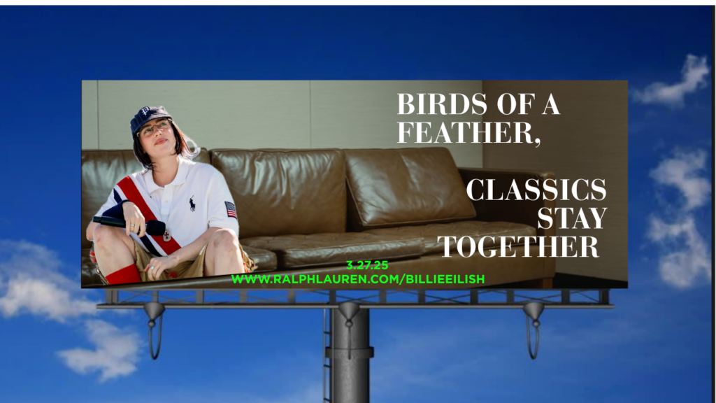 The ultimate call to action and goal for this campaign is to broaden what ‘classic’ means for Ralph Lauren to increase audience engagement, particularly with young adult women. To continuously create staple, classic looks—you need to innovate. Creating this meaningful connection between their structured classic looks and Billie Eilish’s more whimsical and slightly moody style, will exemplify as the song says “Birds of a feather, we should stick together.” Yes—Ralph Lauren and innovation together create forever-evolving classics, and Ralph Lauren’s pieces never go out of fashion.